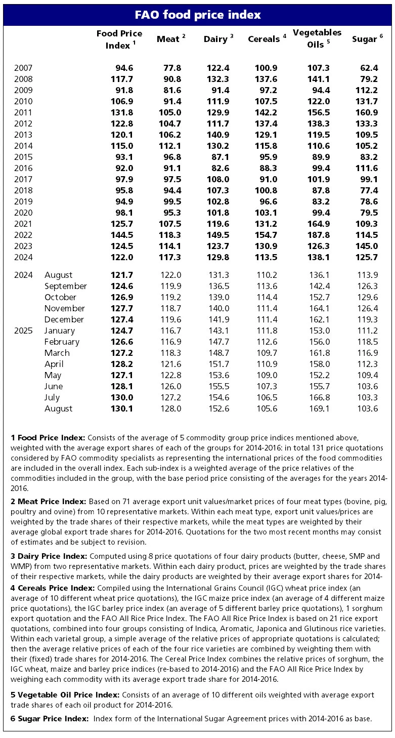 Birləşmiş Millətlər Təşkilatının (BMT) Qida və Kənd Təsərrüfatı Təşkilatı (FAO) bildirir ki, Qida Qiymətləri İndeksi (FFPI) avqust ayında orta hesabla 130,1 bənd səviyyəsində olub və iyul ayına nisbətən (130 bənd) demək olar ki, dəyişməyib.
