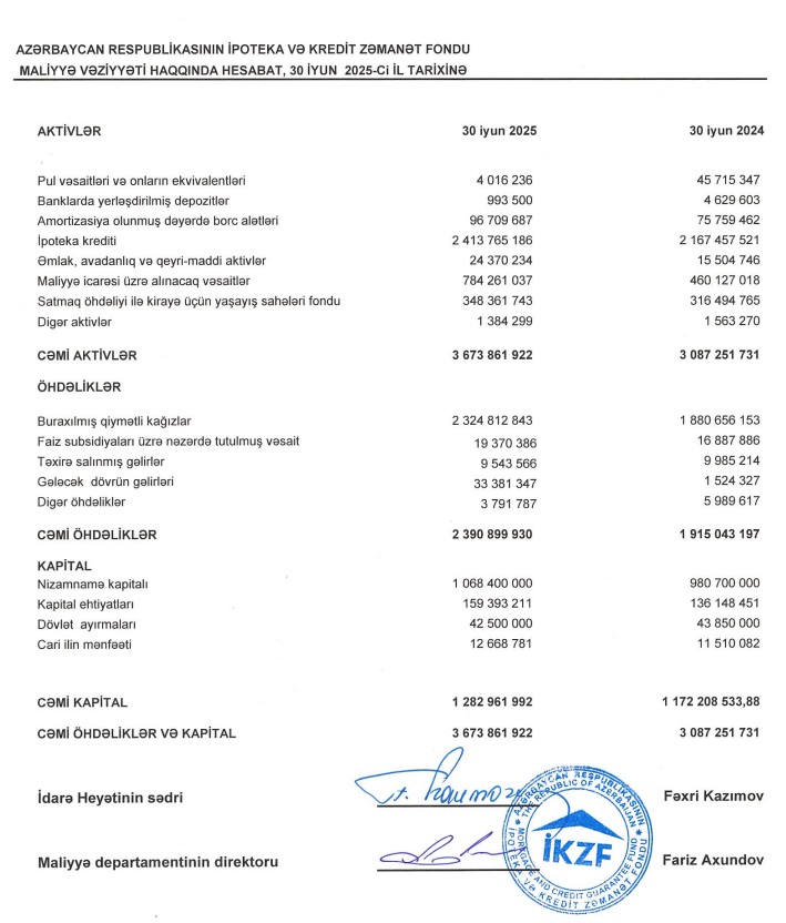30 İyun 2025-ci il tarixində İpotela və Kredit Zəmanəti Fondunun ipoteka portfelinin həcmi 2 milyard 414 milyon manata çatıb (30 iyun 2024-də 2 milyard 167 milyon manat təşkil etmişdi).