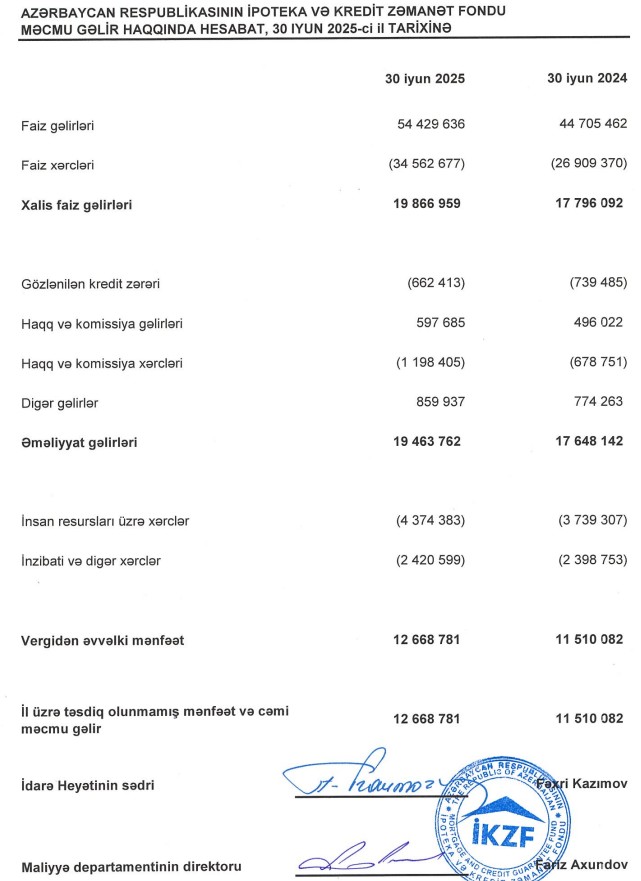 Marja.az Fondun yarımillik hesabatlarına istinadəb xəbər verir ki, İpotela və Kredit Zəmanəti Fondunun faiz gəlirləri 2024-cü ilin ilk 6 ayında 44 milyon 705 min manat ikən, 2025-ci ilin ilk 6 ayınd 54 milyon 430 min manat təşkil edib (9 milyon 725 min manat və ya 21,7% artıb). Fondun haqq və komissiya gəlirləri isə 496 min manatdan 598 min manata yüksəlib.