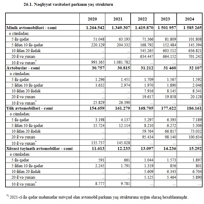 31 dekabr 2024-cü il tarixinə olan məlumata görə, Azərbaycanda dövlət qeydiyyatında olmuş 1 milyon 585 min 265 ədəd minik avtomobillərinin 15,6%-nin və ya 247 min 202 ədədinin yaşı 10 ilədəkdir. O cümlədən 101 min 808 ədəd minik avtomobilinin yaşı 5 ilədək, 145 min 394 ədəd minik avtomobilinin yaşı 5-ildən 10 ilədəkdir.