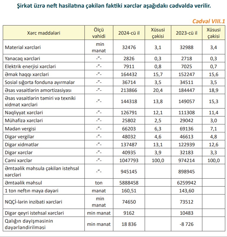 Qeyd edilib ki, şirkət üzrə neft in hasilatı na çəkilən cəmi istehsal xərclərinin tərkibində material xərclərinin xüsusi çəkisi 3,1%, yanacaq xərcləri 0,3%, elektrik enerjisi xərcləri 0,8%, əmək haqqı xərcləri 15,7%, sosial sığortaya ayırmalar 3,5%, əsas vəsaitlərin amorti zasiyası 20,4%, əsas vəsaitlərin təmiri və texniki xidmət xərcləri 13,8%, nəqliyyat xərcləri 12,1%, mühafi zə xərcləri 2,5%, mədən vergisi 6,3%, digər vergilər 4,6%, digər xidmətlər üzrə xərclər 13,1%, digər xərclər isə 3,9% təşkil edir.