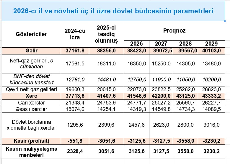 2026-cı ildə xam neftin bir barelinin orta illik satış qiyməti 65 ABŞ dolları səviyyəsində götürülməklə dövlət büdcəsinin gəlirləri ÜDM-in 28,6 faizi həcmində yəni 38 milyard 423 milyon manat nəzərdə tutulur ki, bunun da 42,6 faizi və ya 16 milyard 350 milyon manatı neft-qaz sektorunun, 57,4 faizi və ya 22 milyard 73 milyon manatı qeyri-neft-qaz sektorunun payına düşür.
