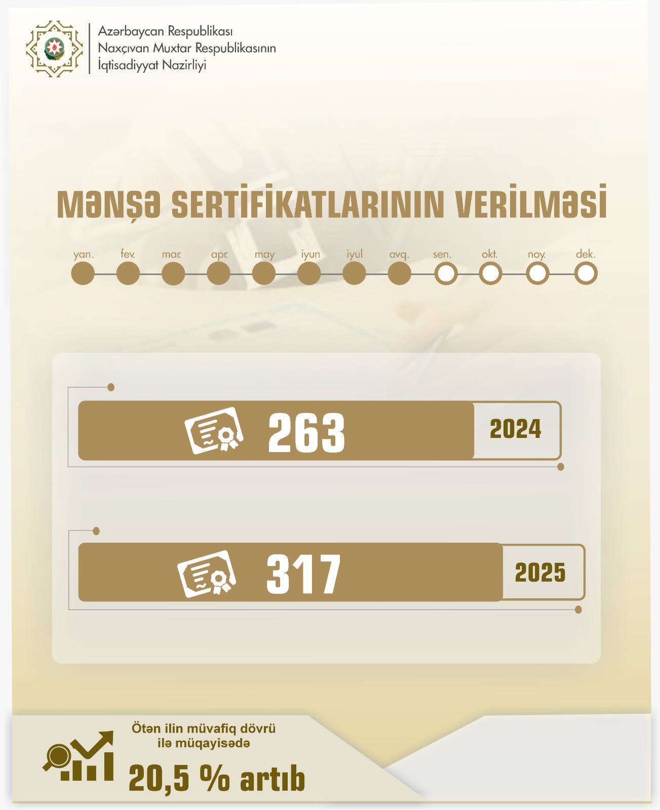 Cari ilin yanvar-avqust aylarında sahibkarlara 317 mənşə sertifikatı verilib ki, bu da ötən ilin müvafiq dövrü ilə müqayisədə 54 ədəd və ya 20,5 faiz çox olub.