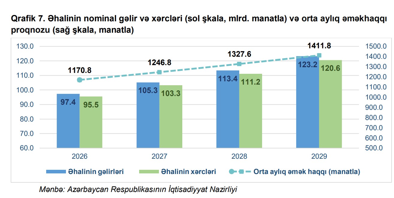 Proqnozlara əsasən ortamüddətli dövrdə əhalinin gəlirlərinin artaraq 2029-cu ildə 123,2 milyard manata, xərclərinin isə 120,6 milyard manata qədər yüksəlməsi gözlənilir.