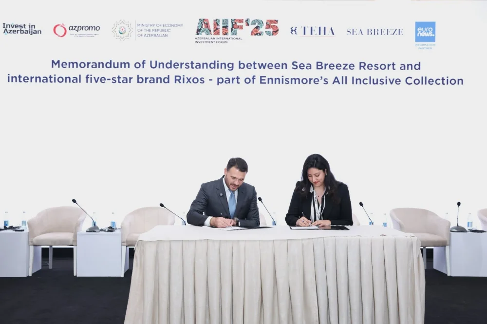 “Sea Breeze Resort” ilə MEAIT və “Rixos” arasında Əməkdaşlıq üzrə Anlaşma Memorandumu imzalanıb. Momoranduma əsasən, 504 otaq və 20 villalı 5 ulduzlu mehmanxananın inşası həyata keçiriləcək. Sənədi “Sea Breeze Resort”un təsisçisi və “Agalarov Development”in prezidenti Emin Ağalarov və MEAIT və “Rixos” şirkətinin İnkişaf üzrə baş meneceri Ritvika Seti imzalayıblar.