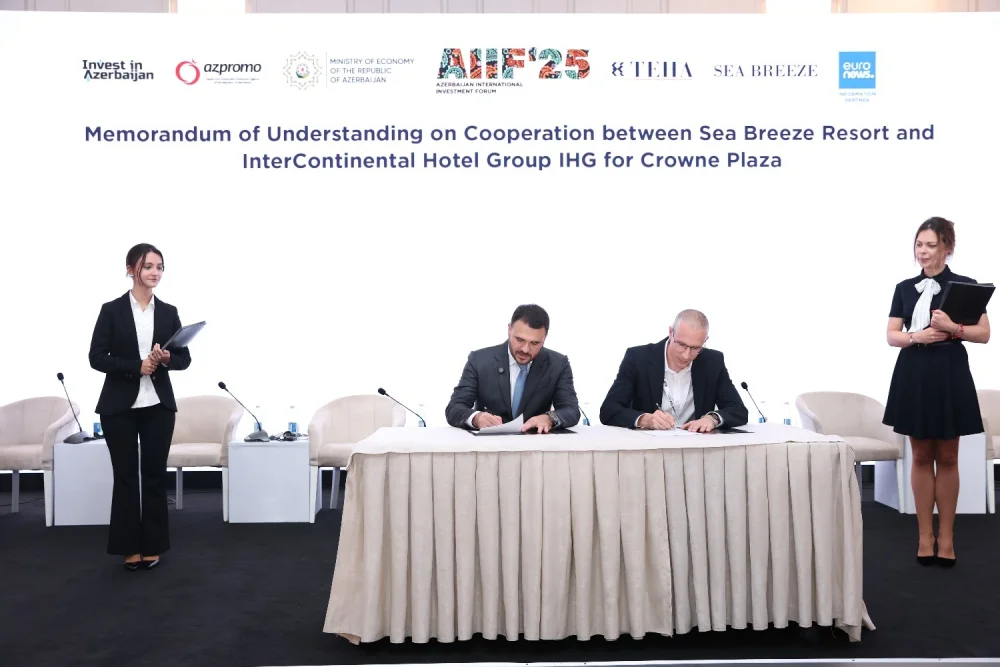 “Sea Breeze Resort” ilə “Crowne Plaza Hotels & Resorts by IHG” arasında Əməkdaşlıq üzrə Anlaşma Memorandumu imzalanıb. Sənədə əsasən, 195 otaqlı, 4 ulduzlu otelin inşası həyata keçiriləcək. Memorandumu “Sea Breeze Resort”un təsisçisi və “Agalarov Development”in prezidenti Emin Ağalarov və “Crowne Plaza Hotels & Resorts by IHG”in MDB, Türkiyə və İsrail üzrə İnkişaf direktoru Aleksis Feuillat imzalayıblar.