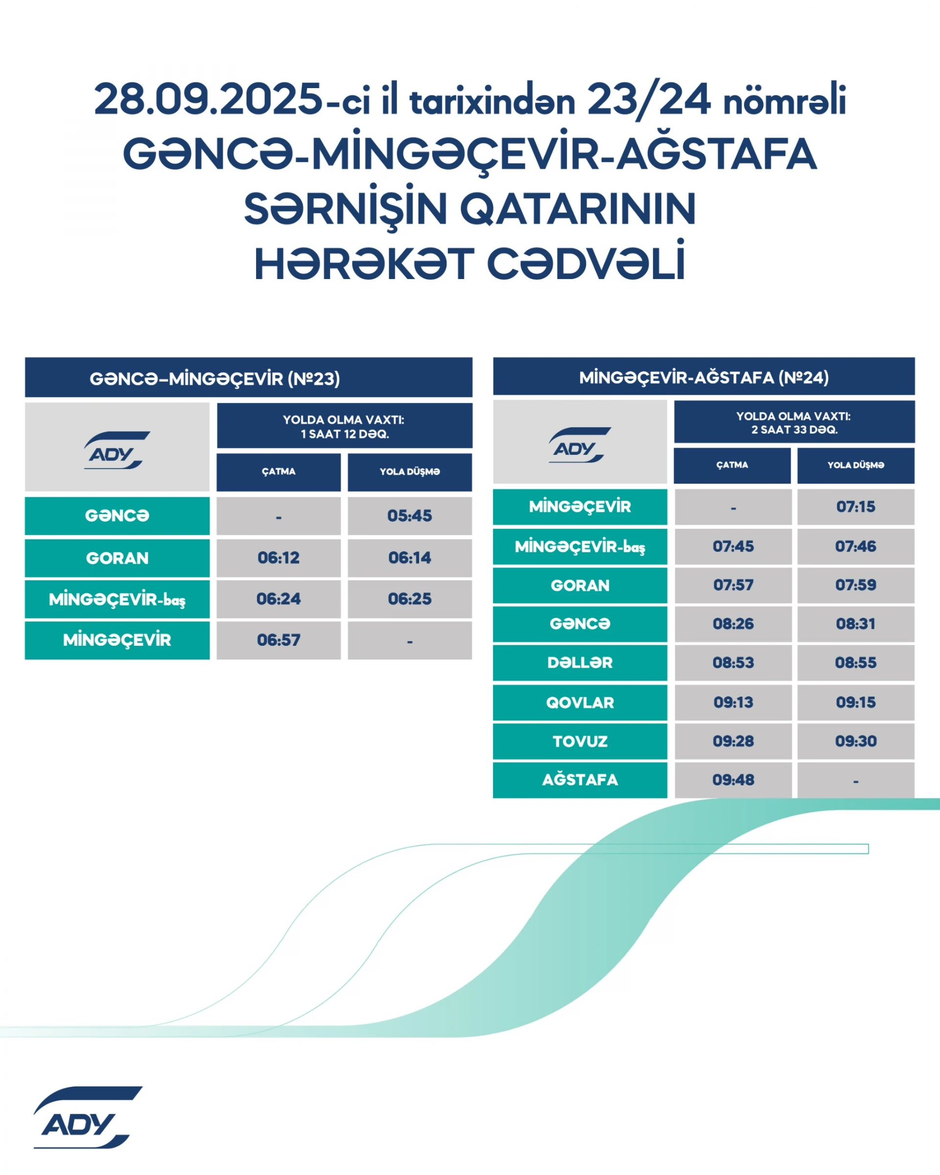 Marja xəbər verir ki, Azərbaycanda dəmir yollarının yaranmasının 145 illiyi ərəfəsində – 28 sentyabr 2025-ci il tarixindən etibarən müasir elektrik qatarları ilə Gəncə–Mingəçevir–Ağstafa marşrutu üzrə gündə 2 dəfə sərnişinlərə xidmət göstəriləcək.