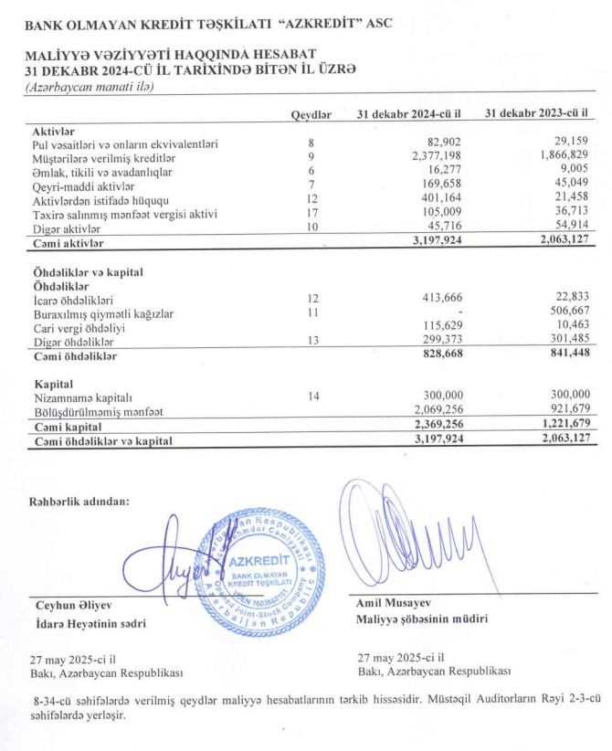 204-cü ildə “Azkredit"in kredit portfeli (müştərilərə verilmiş kreditlər) 510 min manat və ya 27,3% artaraq 31 dekabr 21024-cü il tarixində 2 milyon 377 min manat təşkil edib.