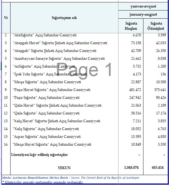 2025-ci ilin yanvar-avqust dövründə (8 ayda) Azərbaycanda fəaliyyət göstərən sığorta şirkətləri tərəfindən 1 milyard 48 milyon 74 min manat sığorta haqları hesablanıb, 603 milyon 414 min manat sığorta ödənişi həyata keçirilib.