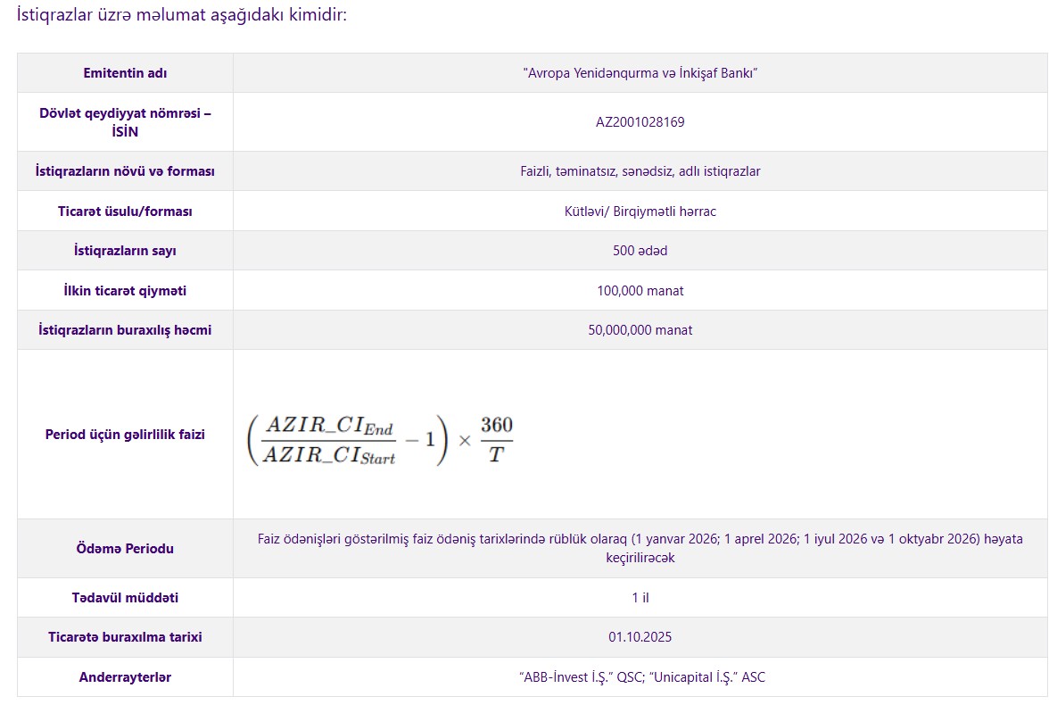 29 sentyabr 2025-ci il tarixində Bakı Fond Birjasının (BFB) Listinq Komitəsinin qərarı ilə "Avropa Yenidənqurma və İnkişaf Bankı”nın 50 milyon manatlıq istiqrazların ticarətə buraxılması üçün “Ticarətə İcazə” qərarı verilib.