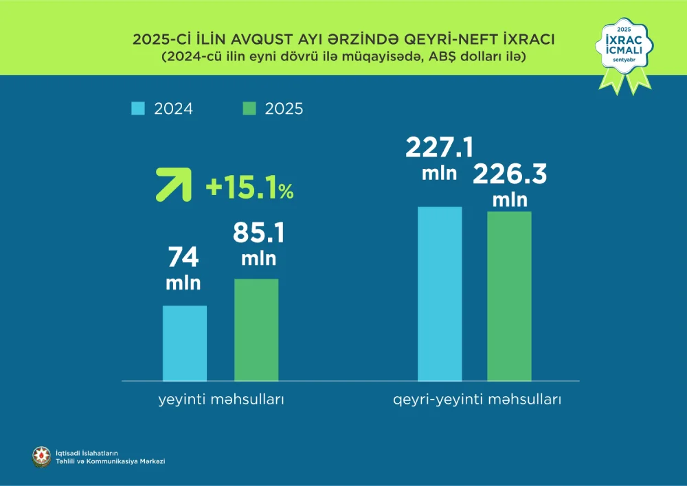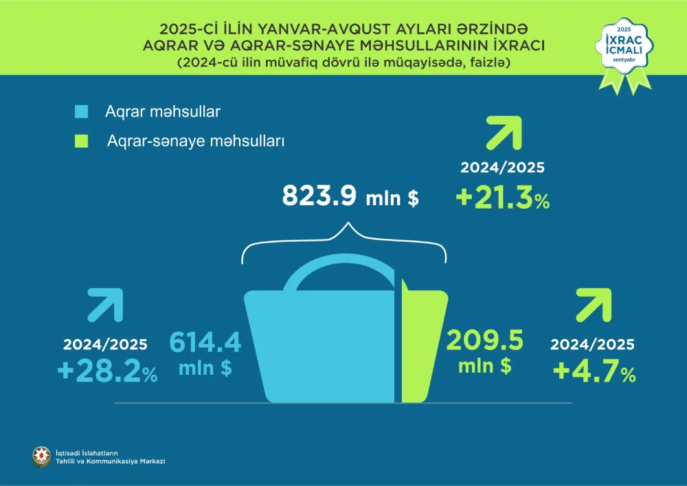2025-ci ilin yanvar-avqust aylarında aqrar məhsullar üzrə ixrac 28,2% artaraq 614,4 milyon ABŞ dolları, aqrar-sənaye məhsulları üzrə ixrac isə 4,7% artaraq 209,5 milyon ABŞ dollarına bərabər olub. Bütövlükdə aqrar və aqrar-sənaye məhsullarının birgə ixracı 21,3% artaraq 823,9 milyon ABŞ dolları təşkil edib.