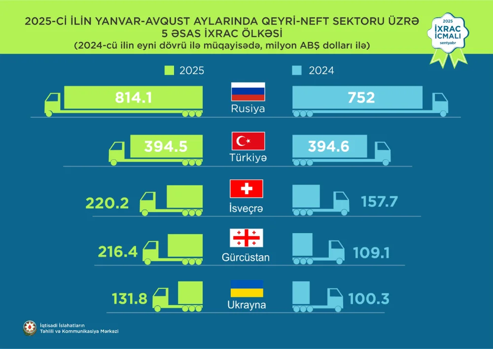 2025-ci ilin avqust ayında Rusiya Federasiyasına 97,4 milyon ABŞ dolları, Türkiyəyə 54,8 milyon ABŞ dolları, İsveçrəyə 33,6 milyon ABŞ dolları, Gürcüstana 32,9 milyon ABŞ dolları, Ukraynaya isə 21,9 milyon ABŞ dolları dəyərində qeyri-neft sektoruna aid mal ixrac edilib.