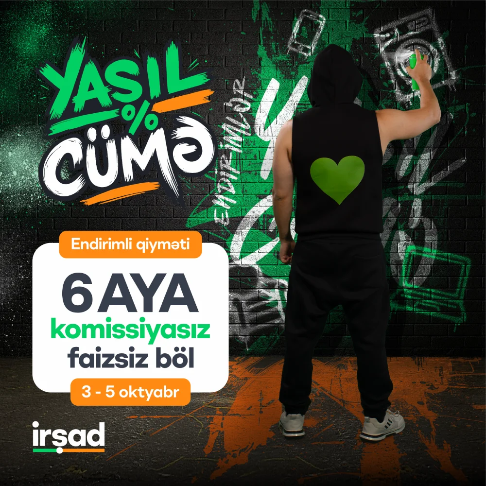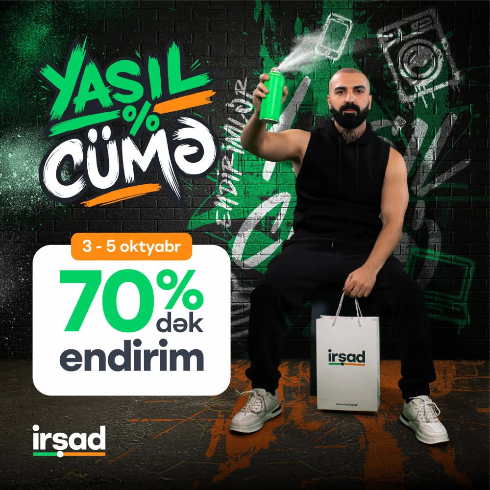 "Yaşıl Cümə" kampaniyası çərçivəsində "Irshad" mağazalar şəbəkələrində və onlayn satış platformalarında müştərilərə ev və şəxsi istifadə üçün elektronika, məişət texnikası, mebellər, smartfonlar və aksessuarlar 70%-ə qədər böyük endirimlə təqdim olunur.