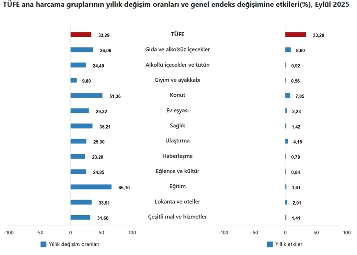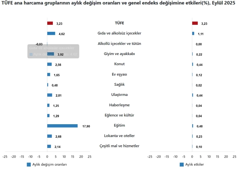 Türkiyə Statistika Qurumunun (TÜİK) açıqladığı sentyabr ayı məlumatlarına görə, İstehlakçı Qiymətləri İndeksi (inflyasiya göstəricisi) belə olub: