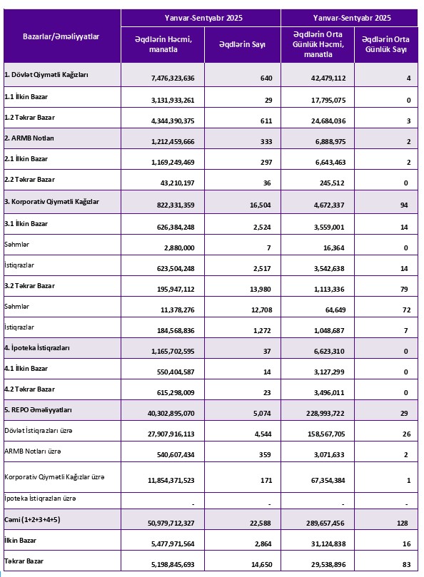 Birjanın dövriyyəsi ötən ilin eyni dövrü ilə müqayisədə 13 milyard 906 milyon 670 min manat və ya 37,5% artıb. Artım əsasən REPO əməliyyatlarının həcmindəki artımdan qaynaqlanır. 2025-ci ilin 9 ayında REPO əməliyyatlarının həcmi 40 milyard 302 milyon 895 min manat təşkil edib (cəmi dövriyyənin 79%-i).