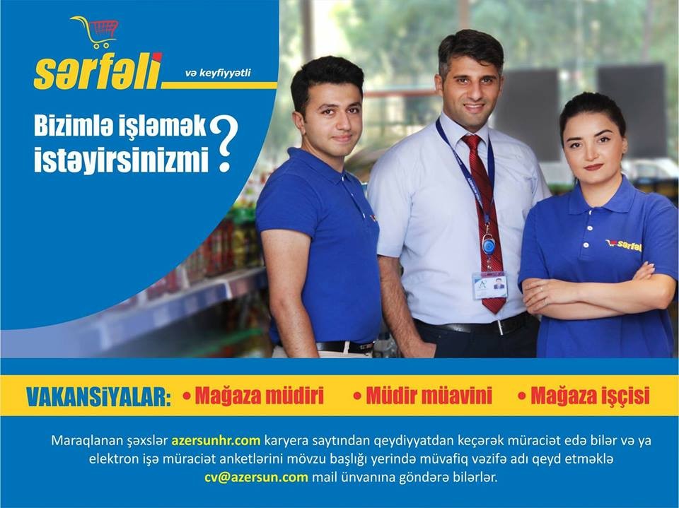 Hazırda mağaza müdiri, müdir müavini və mağaza işçisi vəzifələri üzrə vakansiyalar elan edilib.Maraqlanan şəxslər azersunhr.com saytında qeydiyyatdan keçərək müraciət edə bilər və ya elektron işə müraciət anketinin mövzu başlığı yerində müvafiq vəzifə adını qeyd etməklə [email protected] mail ünvanına göndərə bilər.