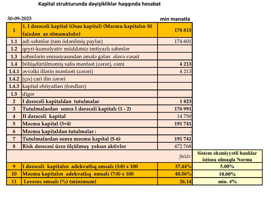 Bankın səhmdar kapitalı ilin əvvəli ilə müqaisədə 20 milyon manat artmışdır. Yeni səhmlərin emissiyası və yerləşdirilməsi nəticəsində Bankın maliyyə dayanıqlığı yüksək səviyyədə saxlanılmışdır. 30.09.2025-ci il tarixinə bankın nizamnamə kapitalı 174 milyon 601 min manat, Məcmu kapitalı isə 191 milyon 741 min manat təşkil etmişdir.