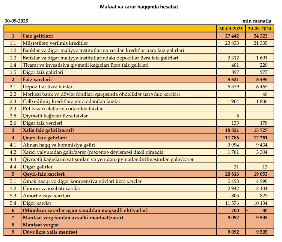 2025-cü ilin 9 ayı ərzində “Premium Bank”ın cəmi əməliyyat gəlirləri (faiz və qeyri-faiz gəlirləri) 39 milyon 228 min manat, cəmi əməliyyat xərcləri (faiz və qeyri-faiz xərcləri) 29 milyon 436 min manat, gəlirlər xərcləri üstələdiyindən əməliyyat mənfəəti 9 milyon 792 min manat təşkil edib. Eyni zamanda, mümkün zərərlər üçün 700 min manat məqsədli ehtiyatlar yaradıldığından 9 milyon 92 min manat xalis mənfəət əldə olunub.