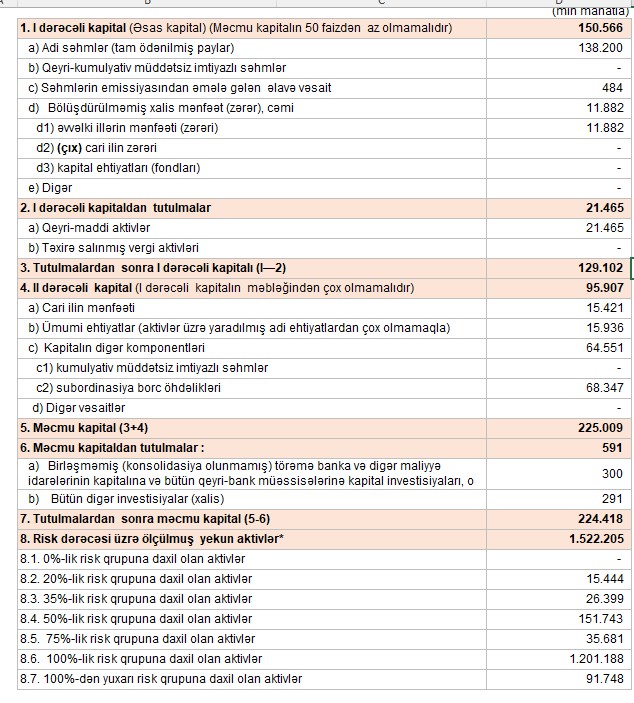 2025-ci ilin 30 sentyabr tarixinə bankın məcmu kapitalı 224 milyon 417 min manat olub. Bu, 2024-cü ilin sonundakı 176 milyon 897 min manatdan 47 milyon 520 min manat və ya 26,8% artım deməkdir.