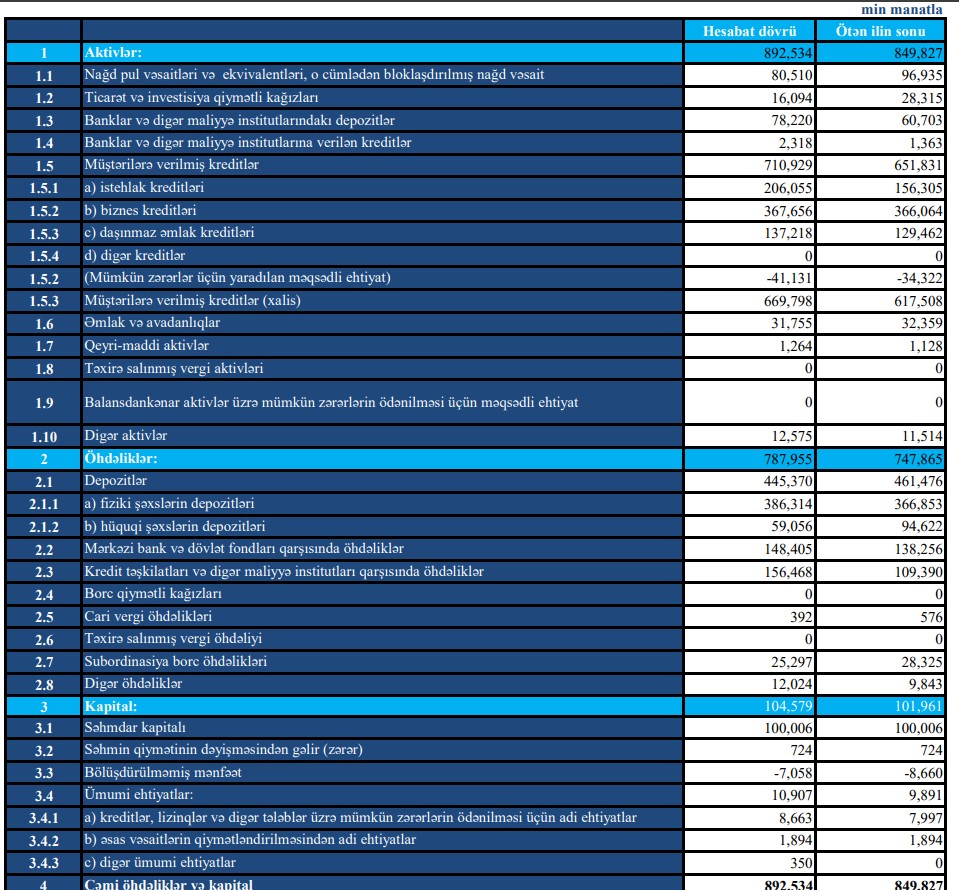 Kredit portfeli isə 710,9 milyon manata çataraq, ötən ilin sonuna nisbətən 59,1 milyon manat və ya 9,1% böyüyüb.