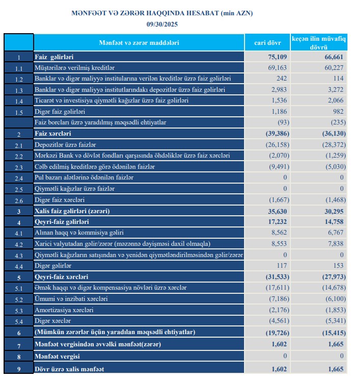 Faiz xərcləri isə 39,4 milyon manat olub ki, bu da 3,3 milyon manat və ya 9,0% artım deməkdir (2024 – 36,1 milyon manat).