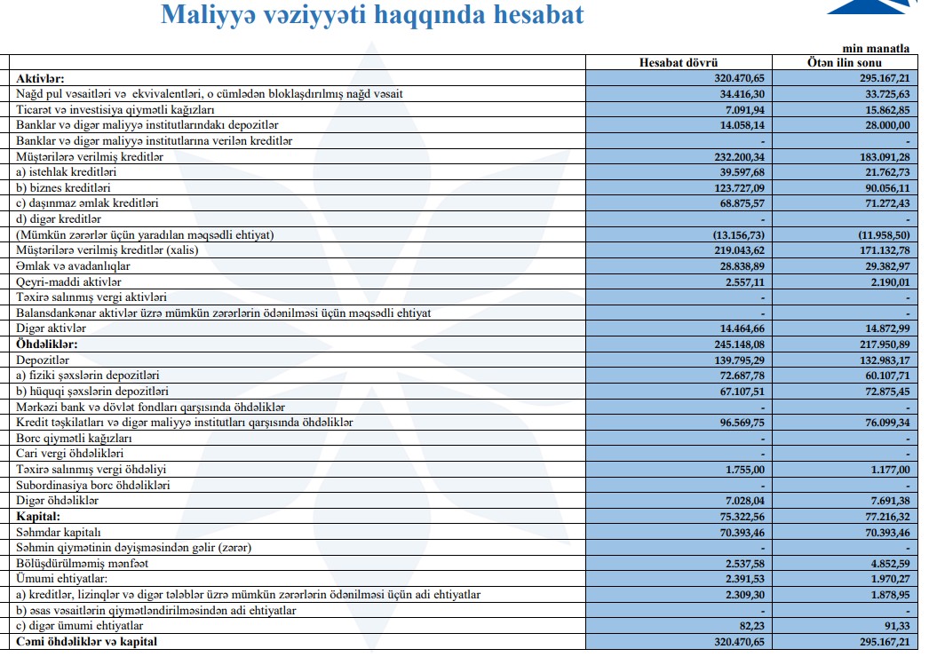 Bankın kredit portfeli hesabat dövründə 183 milyon 91 min manatdan 232 milyon 200 min manata yüksəlib. Bu, 26,8% artım deməkdir.