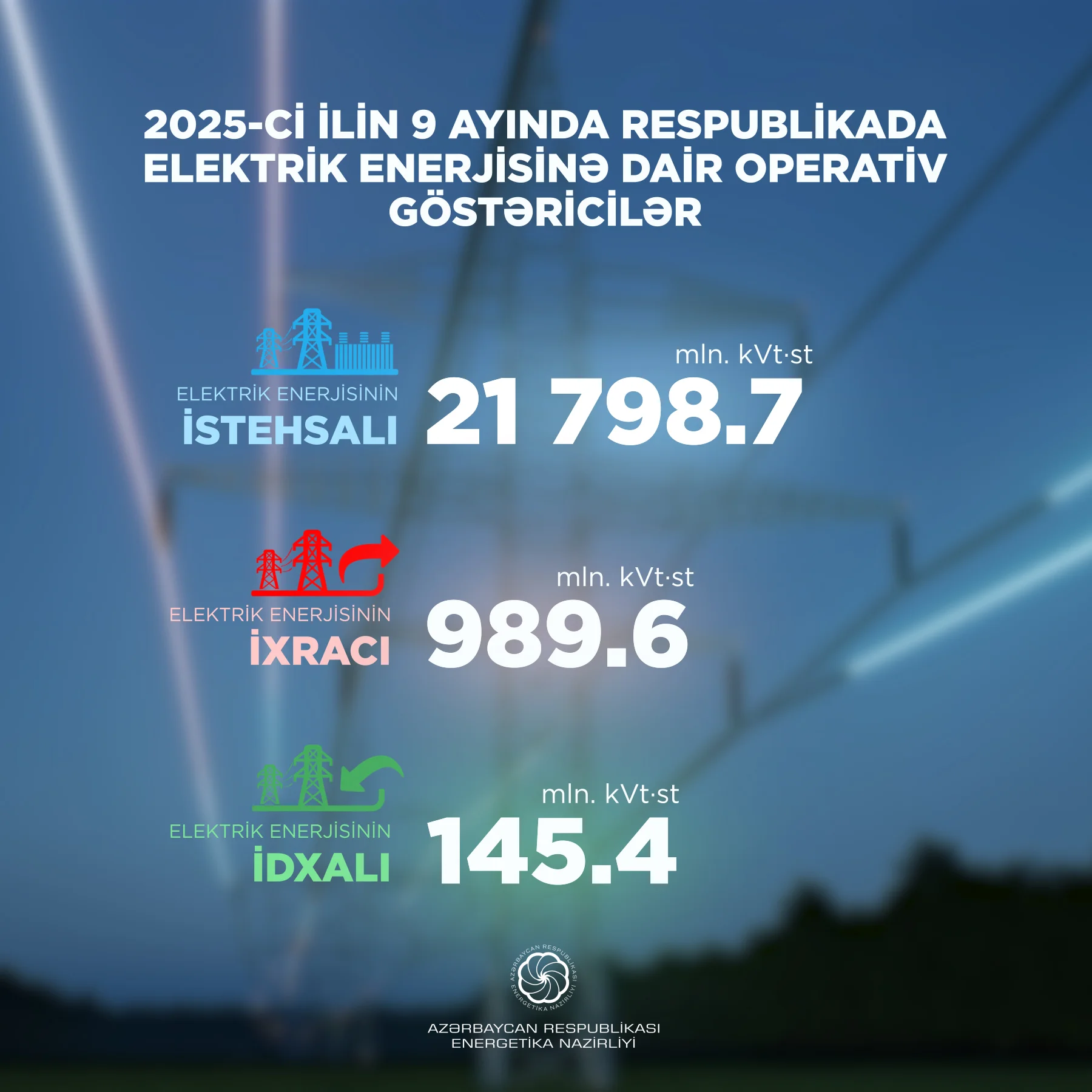 9 ay ərzində elektrik enerjisinin istehsalı “Azərenerji” ASC üzrə 19 520,7 mln. kVt·st (İES-lərdə 17 070,6 mln. kVt·st, SES-lərdə 2 401,1 mln. kVt·st, GES-lərdə 49,0 mln. kVt·st), “Azərişıq” ASC üzrə külək elektrik stansiyalarında 21,5 mln. kVt·st, müstəqil elektrik stansiyaları üzrə isə 2 256,5 mln. kVt·st təşkil edib.