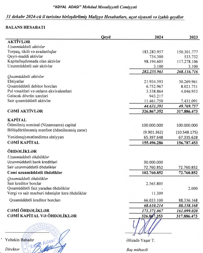 31 dekabr 2024-cü il tarixində “Xəyal Adası” MMC 326 milyon 867 min manat cəmi aktivlərə malik olub. Şirkət 2023-cü ilin sonunda 317 milyon 886 min manat cəmi aktivlərə malik idi.
