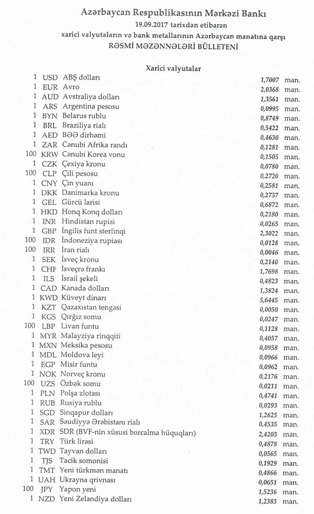 Sentyabrın 18-də rəsmi olaraq 1 dollar 1,7007 manata, 1 avro isə 2.0309 manata bərabər idi.