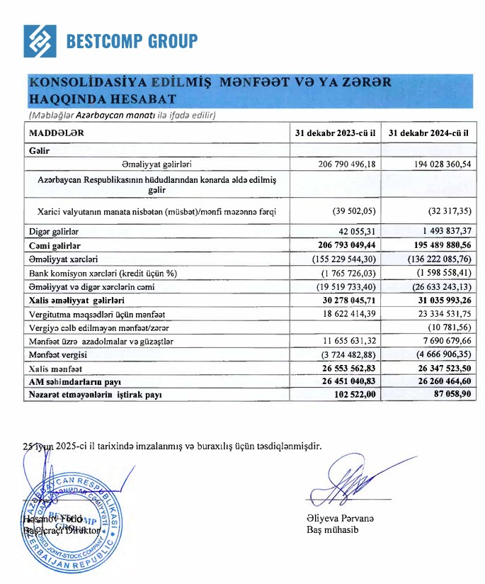 Marja.az xəbər verir ki, 2023-cü ildə "Bestcomp Group"un satışdan gəlirləri (əsas əməliyyat gəlirləri) 2023-cü ildə 206 milyon 790 min manat ikən, 2024-cü ildə 194 milyon 28 min manat təşkil edib (12 milyon 762 min manat və ya 6,6% azalıb). Şirkətin digər gəlirləri isə 35 dəfədən çox artaraq 42 min manatdan 1 milyon 494 min manata qalxıb.