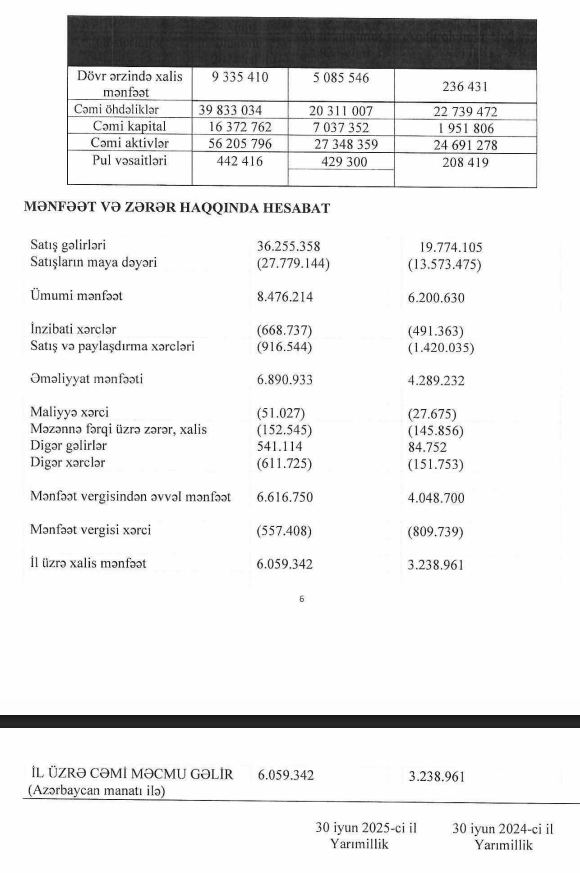2025-ci ilin ilk 6 ayında "Azərmaş Group" MMC-nin satışdan gəlirləri 36 milyon 255 min manat, xalis mənfəəti isə 6 milyon 59 min manat təşkil edib. 2024-cü ilin ilk 6 ayında Şirkətin satışdan gəlirləri 19 milyon 774 min manat, xalis mənfəəti 3 milyon 239 min manat təşkil etmişdi. Beləliklə, 6 aylıq müqayisədə də "Azərmaş Group"un gəlirləri və xalis mənfəəti müvafiq olaraq 1,8 dəfə və 1,9 dəfə artıb.