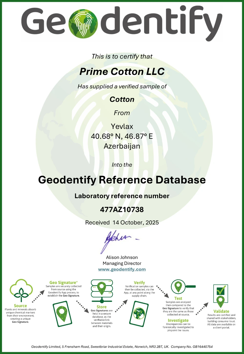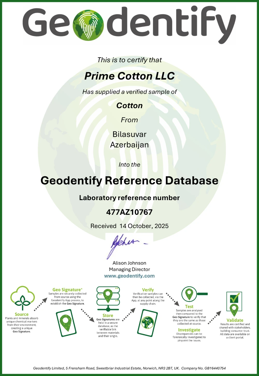 Bu təşəbbüs çərçivəsində Prime Cotton və onun fermer tərəfdaşları tərəfindən təqdim olunan pambıq nümunələri "Geodentify Reference Database"ya daxil edilib və şirkət rəsmi olaraq pambığın coğrafi mənşəyini təsdiqləyən sertifikat əldə edib.