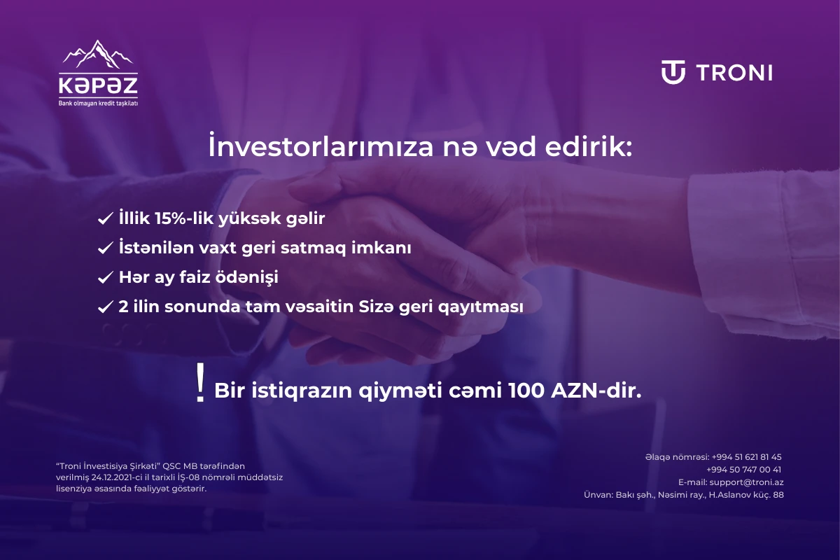 Vergisiz 15% gəlir, aylıq ödəniş, istədiyin zaman toplanmış faizlə geri sat!(®) “Troni İnvestisiya Şirkəti” QSC-nin yaxın zamanda buraxılışını həyata keçirəcəyi “Kəpəz BOKT” MMC-nin istiqrazları öz investorlarına eyni zamanda həm yüksək likvidlik həm də illik 15%-lik yüksək gəlir əldə etmək imkanı təklif edir.