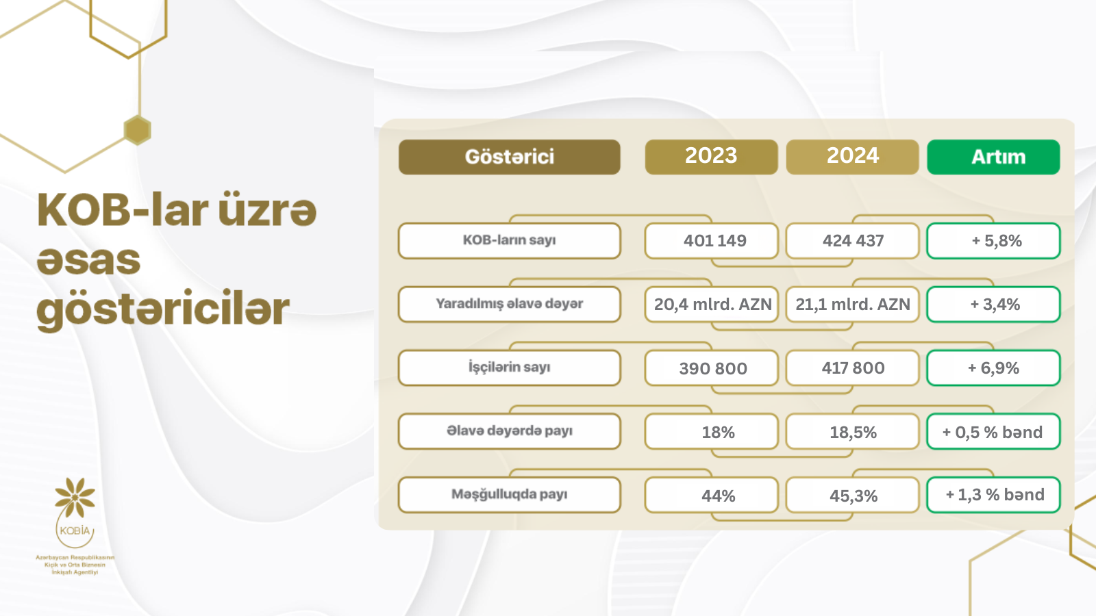 Dövlət Statistika Komitəsinin məlumatına əsasən 2024-cü ildə KOB-ların sayı 424 min 437 olub ki, bu əvvəlki illə müqayisədə 5,8% çoxdur. 2023-cü illə müqayisədə ötən il KOB-ların yaratdığı əlavə dəyərin həcmi 3,4% artaraq 21,1 milyard manat təşkil edib.