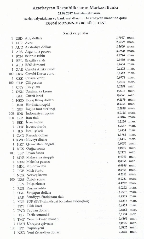 Sentyabrın 20-da rəsmi olaraq 1 dollar 1,7007 manata, 1 avro isə 2.0421 manata bərabər idi.