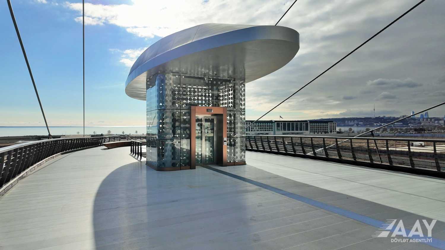 Azərbaycan Avtomobil Yolları Dövlət Agentliyinin yaydığı məlumatda bildirilir ki, uzunluğu 234 metr, eni isə 7-13 metr arası dəyişən piyada körpüsü bir aşırımlı olmaqla layihələndirilib. Piyada körpüsü metal tir aşırım qurğusundan ibarətdir və 1 ədəd pilon dayaqdan vantlar vasitəsilə “asılıb”.