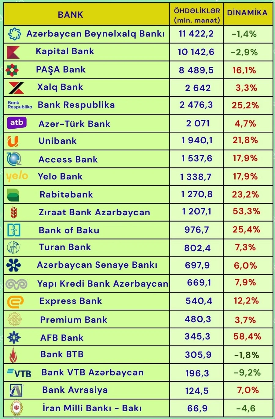 17 bankın isə öhdəlikləri artıb. Bu baxımdan ən yüksək dinamika “AFB Bank”da (58,4%), ən aşağı dinamika isə “Xalq Bank”da (3,3%) qeydə alınıb.