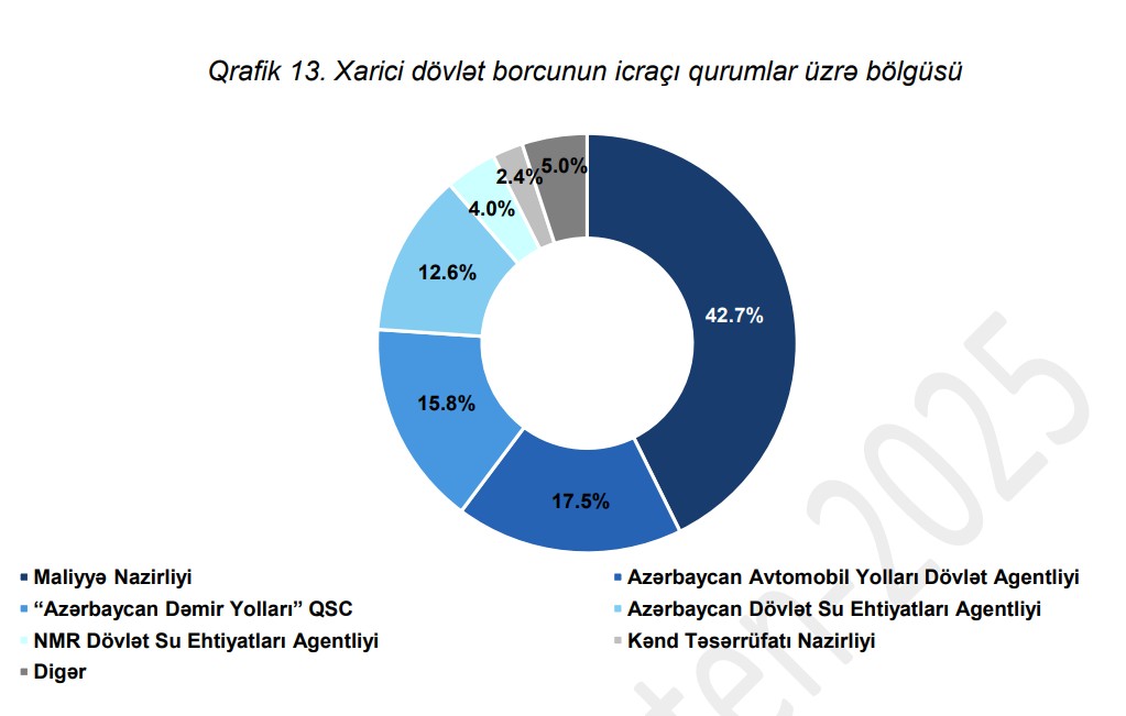 Maliyyə Nazirliyi, Azərbaycan Avtomobil Yolları Dövlət Agentliyi, “Azərbaycan Dəmir Yolları” QSC, Azərbaycan Dövlət Su Ehtiyatları Agentliyi, Naxçıvan Dövlət Su Ehtiyatları Agentliyi və Kənd Təsərrüfatı Nazirliyi ən çox xarici borcu olan dövlət qurumlarıdır.