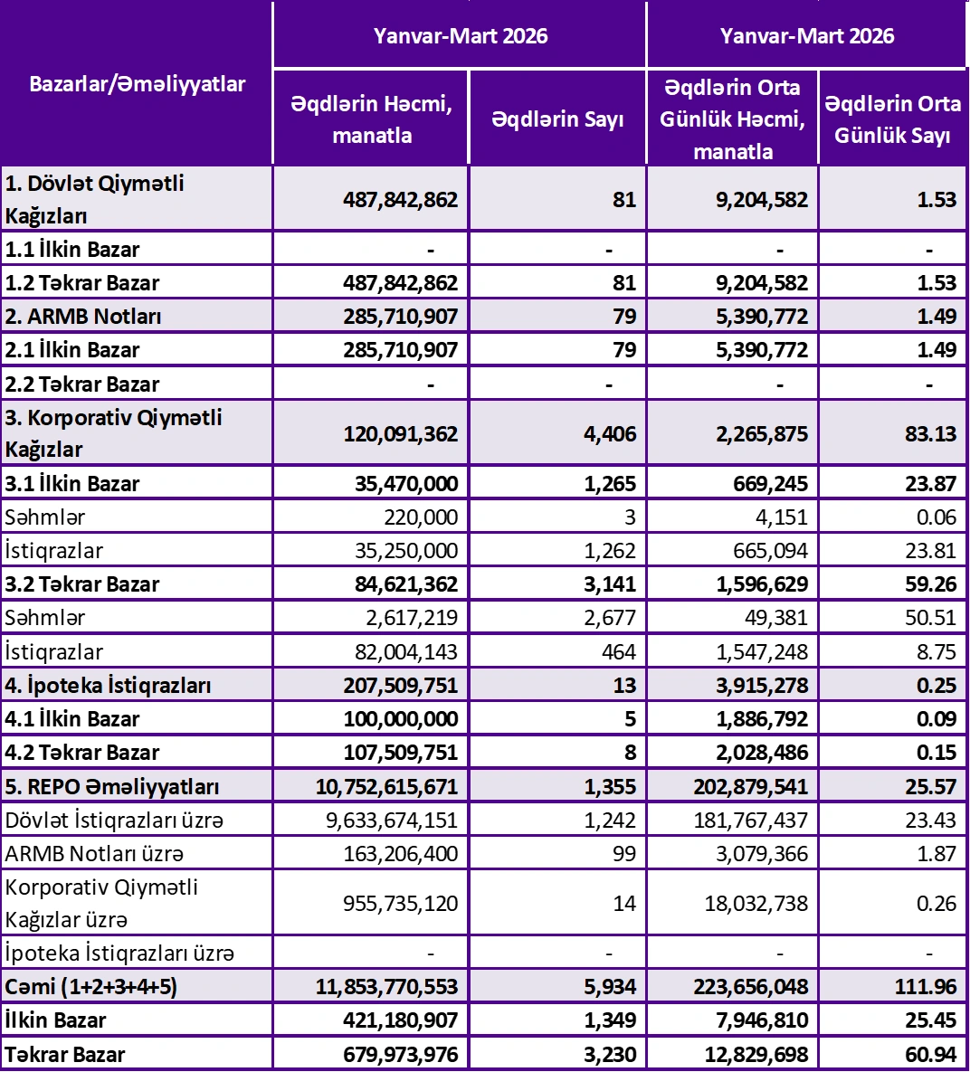 2026-cı ilin ilk rübü ərzində (yanvar-mart) Bakı Fond Birjasının (BFB) ticarət dövriyyəsinin cəmi məbləği 11 milyard 853 milyon 770 min manat, o cümlədən REPO əməliyyatlarının məbləği 10 milyard 752 milyon 616 min manat təşkil edib.