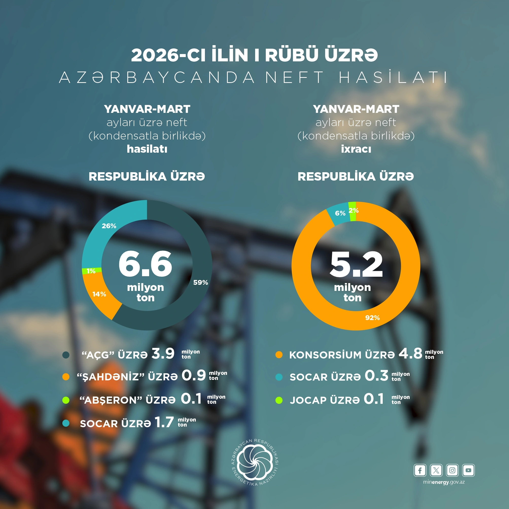 2026-cı ilin yanvar-mart aylarında ölkədə 12,6 milyard kubmetr təbii qaz hasil edilib. Hasil edilmiş qazın 3,5 milyard kubmetri “Azəri-Çıraq-Günəşli”nin, 6,9 milyard kubmetri “Şahdəniz”in, 0,4 milyard kubmetri “Abşeron” yatağının, 1,8 milyard kubmetri isə SOCAR-ın payına düşüb.