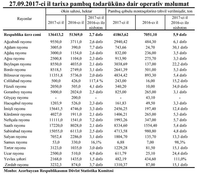 Dövlət Statistika Komitəsindən "Marja"ya daxil olmuş məlumata görə, 27.09.2017-ci il tarixə olan operativ məlumata görə, respublika üzrə 41863,62 ton pambıq yığılıb.