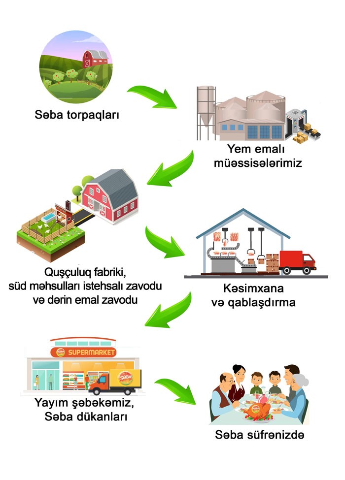 Azərbaycan alıcısına adı və dadı ilə tanış olan “Səba”nın qida təhlükəsizliyinə öz zəmanəti var. Əvvəlcə onu qeyd etmək yerinə düşər ki, «Səba” şirkətinin həm toyuq, həm də süd məhsulları istehsalatı beynəlxalq qida təhlükəsizliyi sistemi olan ISO 22000:2005 standartına cavab verir. Lakin “Səba” istehsal prosesini standarta uyğun qurmaqla kifayətlənməyib. Şirkət qida zəncirinin bir neçə halqasını özündə birləşdirib. İnfoqrafikada daha aydın görünən bu halqalar biri-biri ilə ayrılmazdır və qarşılıqlı əlaqəlidir. Belə ki: