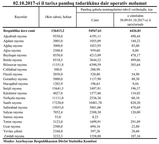 Oktyabrın 2-dək pambıq qəbulu məntəqələrinə ölkə üzrə 54 min 547,61 ton məhsul təhvil verilib.