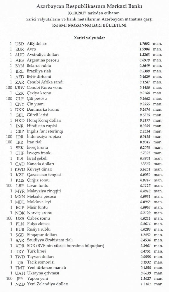 Oktyabrın 2-də rəsmi olaraq 1 dollar 1,7002 manata, 1 avro isə 2.0023 manata bərabər idi.