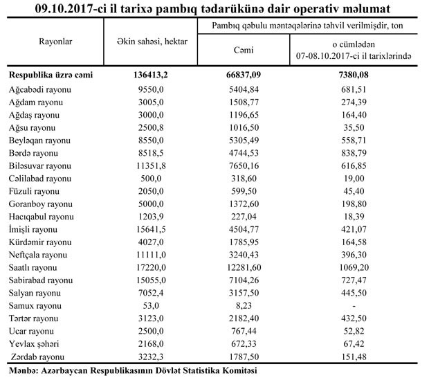 Dövlət Statistika Komitəsindən bildiriblər ki, oktyabrın 7-8-də 7380,08 ton pambıq tədarük olunub.