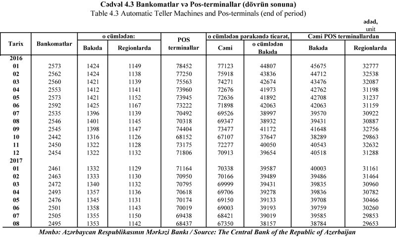 Bakıda 38784 ədəd (4,3% azalıb), regionlarda 29653 ədəd (5,3% azalıb) pos-terminal mövcuddur.