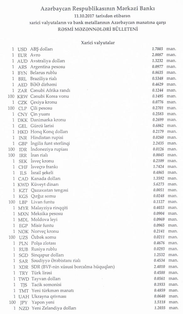 Oktyabrın 10-da rəsmi olaraq 1 dollar 1,7002 manata, 1 avro isə 2.0011 manata, 1 Rubl 0,0292 manata bərabər idi.