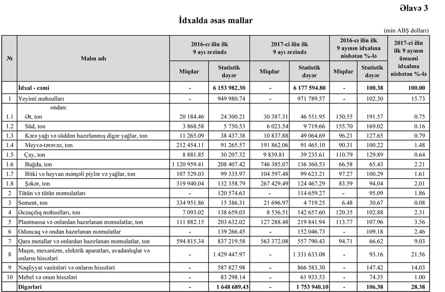 2017-ci ilin yanvar-sentyabr ayları ərzində Azərbaycanın ən çox idxal və ixrac etdiyi mallar.