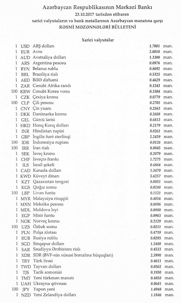 Oktyabrın 23-nə Mərkəzi Bankın açıqladığı rəsmi Dollar/manat məzənnəsi Oktyabrın 20-si ilə müqayisədə dəyişməyərək 1,7001 manat olub, Avro/manat məzənnəsi 2.0010 manata, Rubl/manat məzənəsi isə 0,0295 manata düşüb .