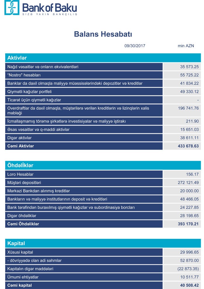 “Bank of Baku” 30 Sentyabr 2017-ci il tarixində 433 milyon 678 min manat cəmi aktivlərə, 393 milyon 170 min manat cəmi öhdəliklərə və 40 milyon 508 min manat cəmi balans kapitalına malik olub.
